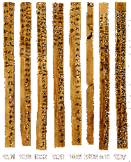 元康五年詔書Imperial Edict of 61 B.C. A33地灣出土 A33 Ulan-durbeljin, Edsen-gol, Kansu 長23.4-24.1,寬1.5-1.8公分 Length 23.4-24.1,width l.5-l.8 cm. 西漢宣帝元康五年(西元前61年)依據月令,通令全國為夏至改火等事所下的詔書。詔書後附各單位傳送的記錄。本冊據零簡復原。 This edict is dated to the fifth year of the era Yuan K'ang of the Han period, that is 61 B.C. Based on a system of monthly ritual observances it orders certain empire-wide measures to be taken before and during the summer solstice in that year. Attached at the end is the consecutive record of units copying and forwarding the order from the capital to the frontier region. Since the connecting strings have long since decomposed, the single strips had to be identified as belonging together and put into correct sequence by modern scholars. |